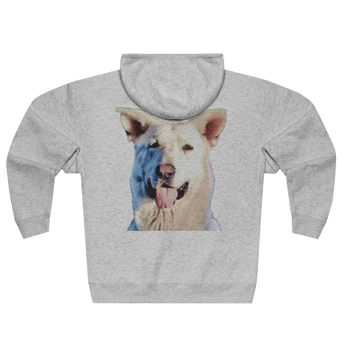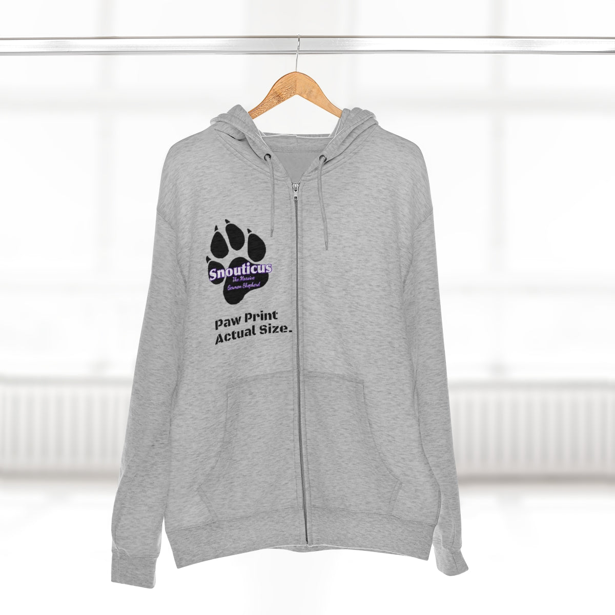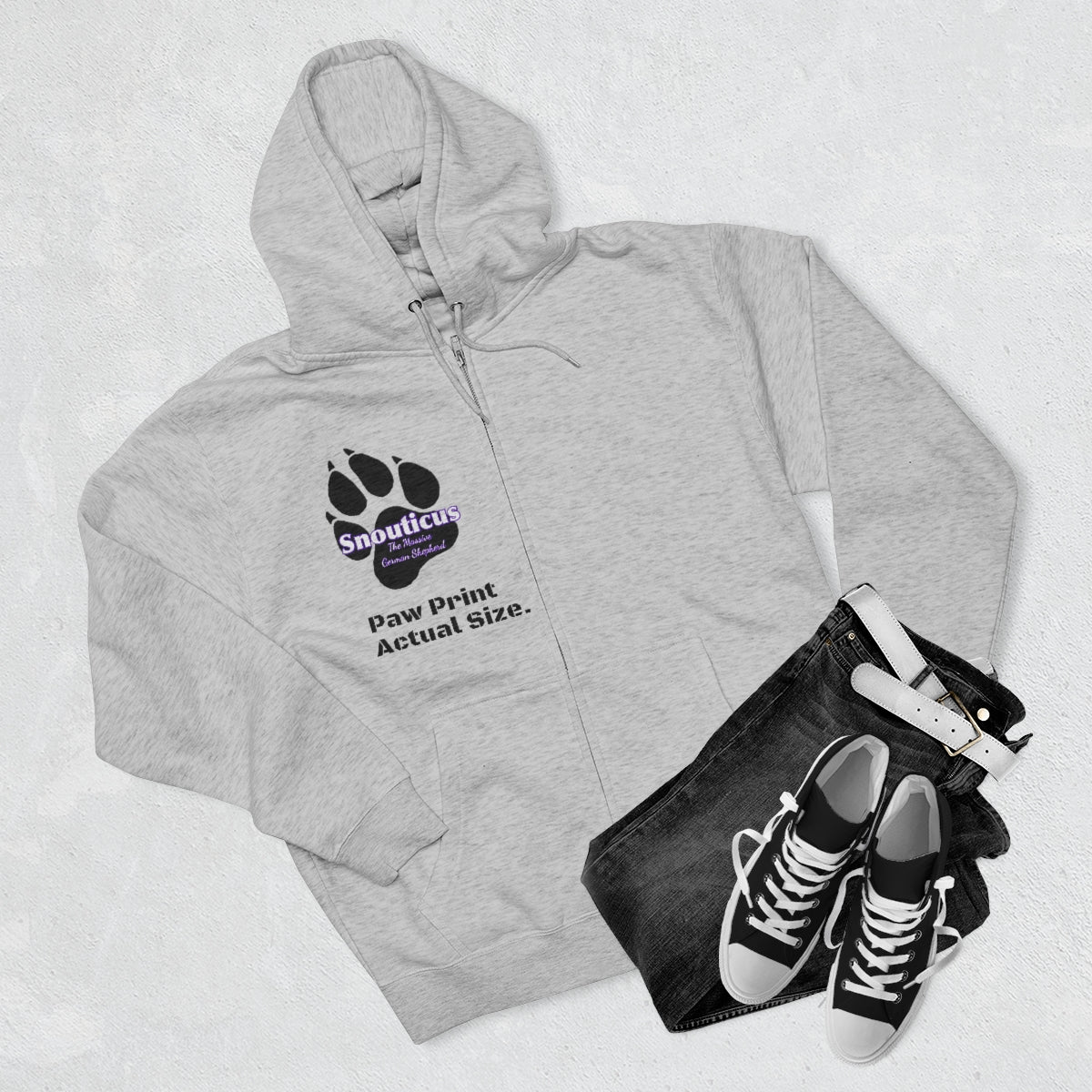 Snouticus on the back, and a life sized paw print on the front! Full zip!